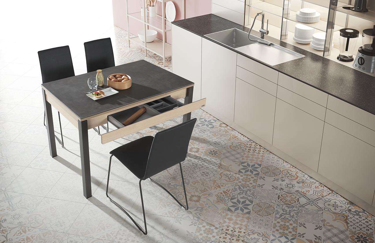 - Encimera: Cristal (blanco, extrablanco), porcelánico TECHLAM, Laminam, Neolith, Dekton, HPL, o Fénix.