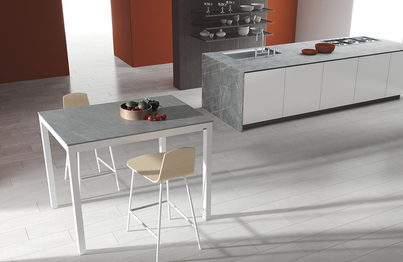 Con chasis y patas metálicas en epoxi plata y encimera en hpl f058 de polyrey.
