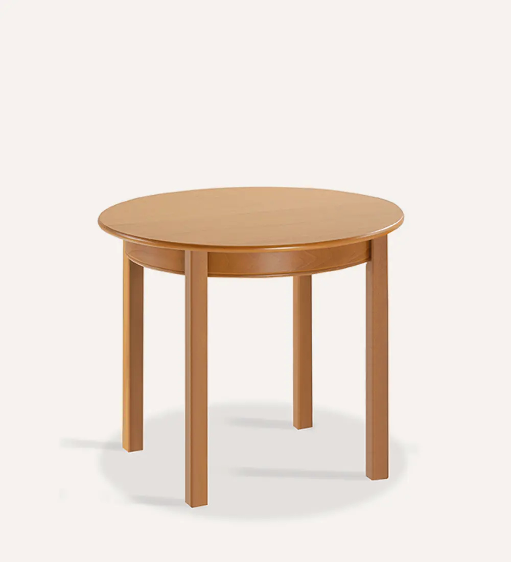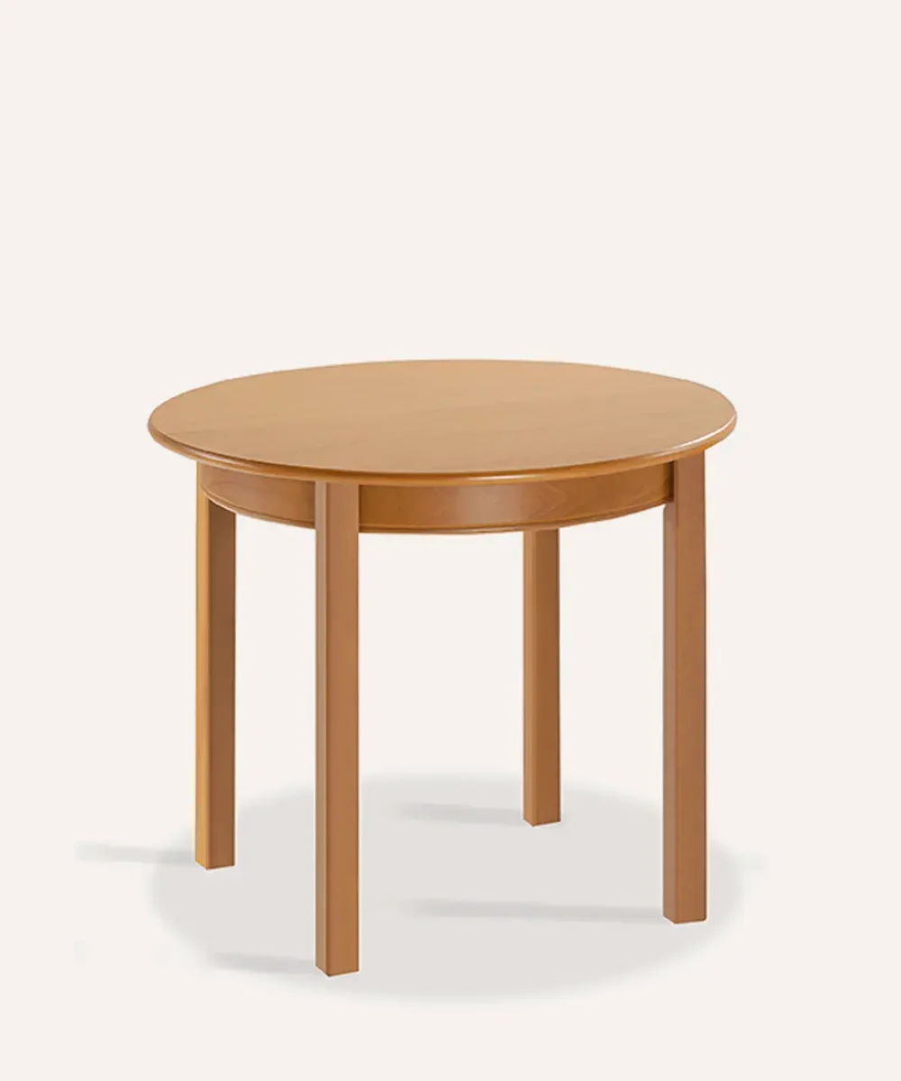 Mesa redonda con extensible central que permite ampliar la superficie de la mesa simplemente desplazando sus alas. Patas de sección cuadrada de madera natural acabadas con Barnizado en color Natural o Cerezo y Lacado Blanco. Chasis y encimera fabricado en Laminado disponible en Natural, Cerezo o Blanco.