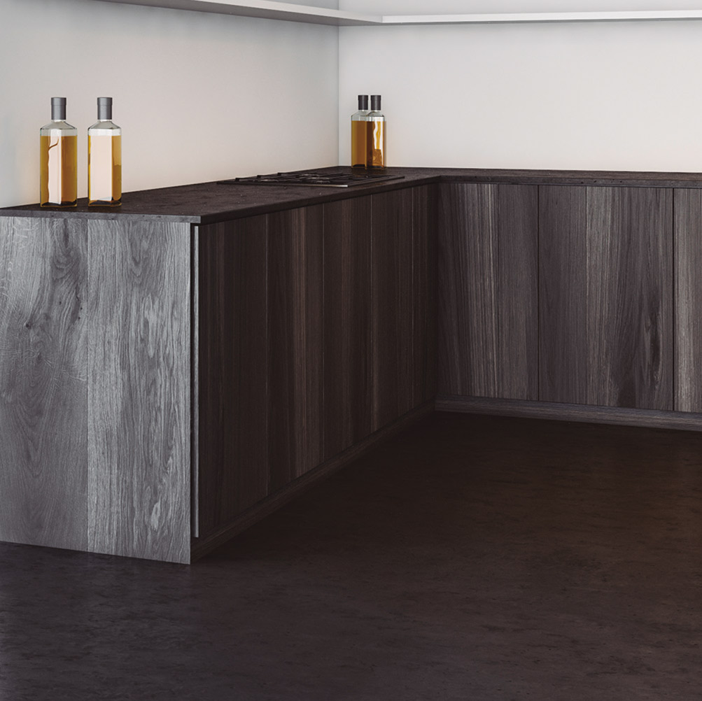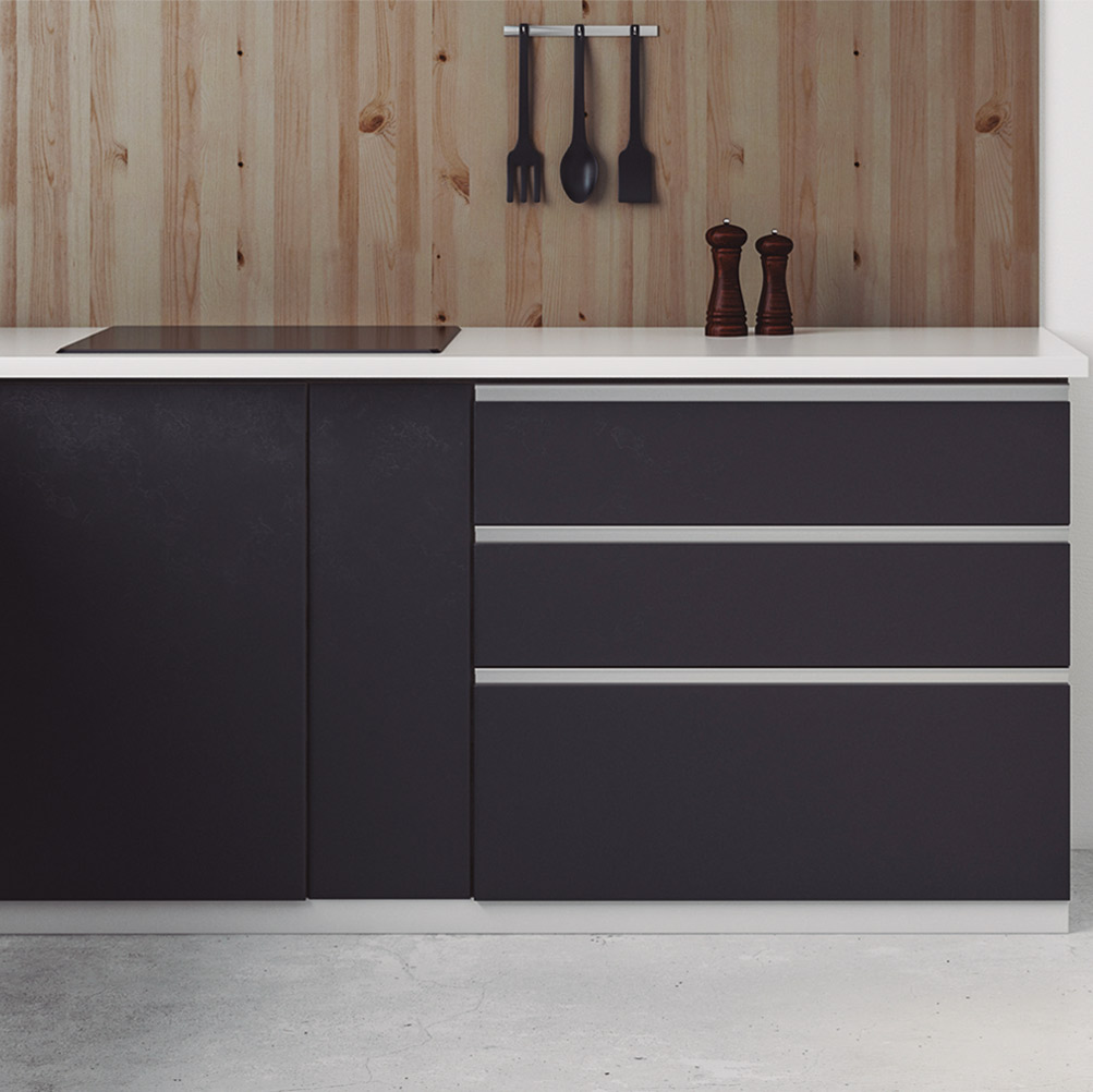 Las encimeras de cristal, cerámica, Dekton y Silestone van enrasadas con la portería y pegadas sobre el tablero. Para la sujeción del tablero al chasis, colocamos 6 soportes atornillados a este y preparados para atornillar al tablero, con su tapa para ocultar los tornillos.