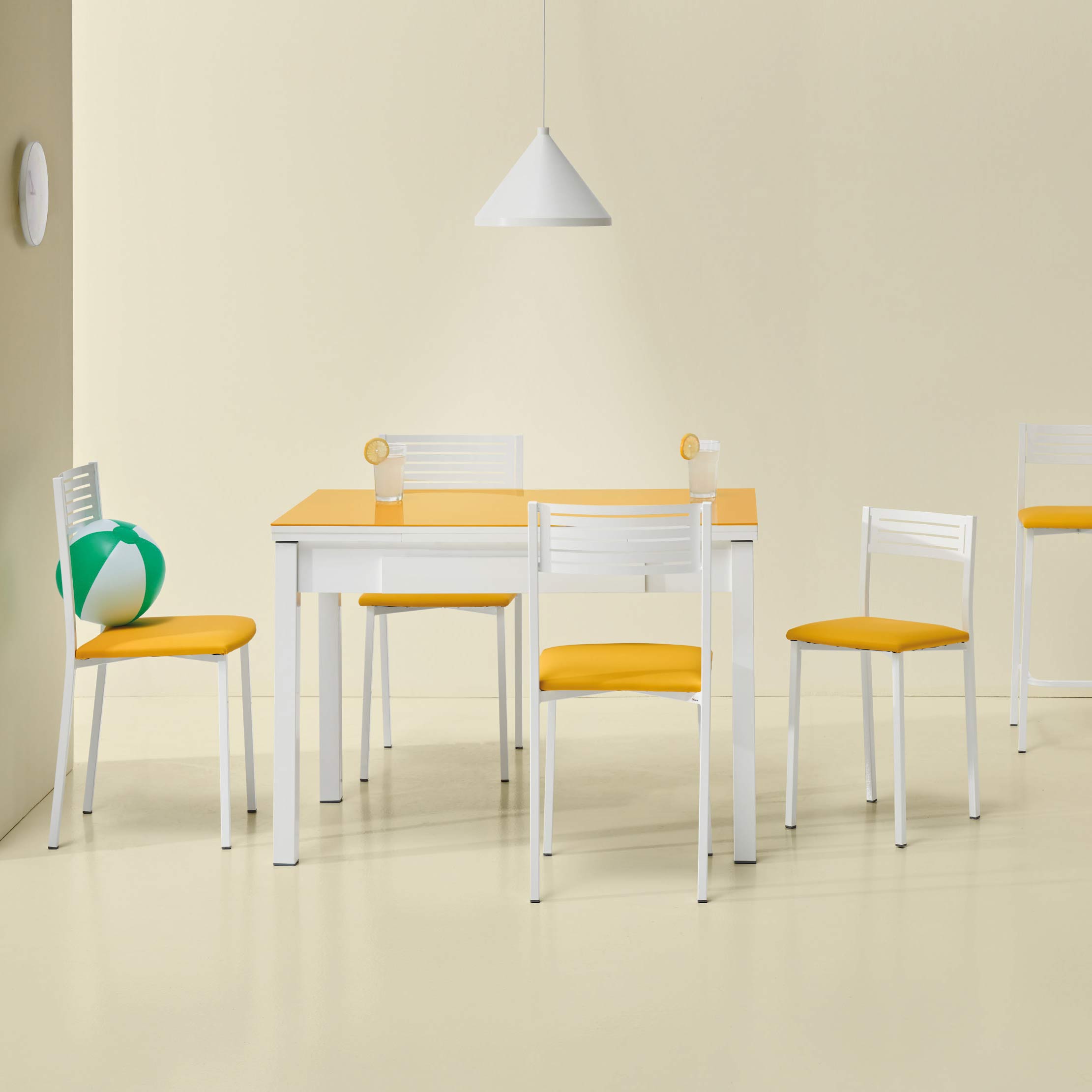 Esta silla cuenta con un diseño minimalista en el que las líneas caladas en su respaldo a modo de parrilla, generan juegos de luces y sombras que bañaran el entorno de tu cocina. La suave curvatura que recorre sus patas traseras hasta el respaldo, le proporciona la inclinación perfecta para el reposo de la espalda, aportándole una gran comodidad. Su estructura en cruz bajo el asiento le proporciona una gran rigidez y a su vez le aporta una ligereza visual en la que el asiento parece estar en el aire. Un producto muy versátil con una gran variedad de acabados que puede encajar en cualquier tipo de cocina.