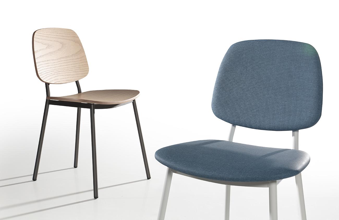 Silla muy versátil. Con un chasis metálico, permite seleccionar el respaldo y el asiento en madera o tapizado todo uniforme y también combinado.