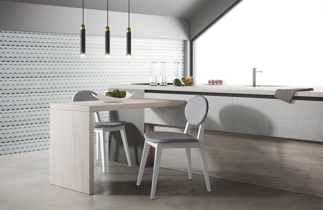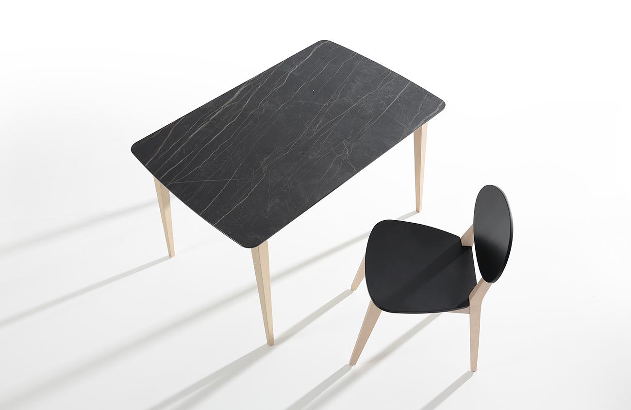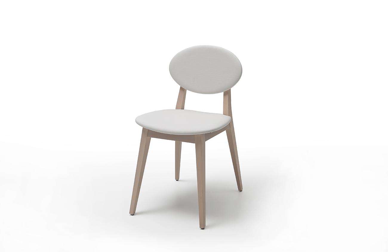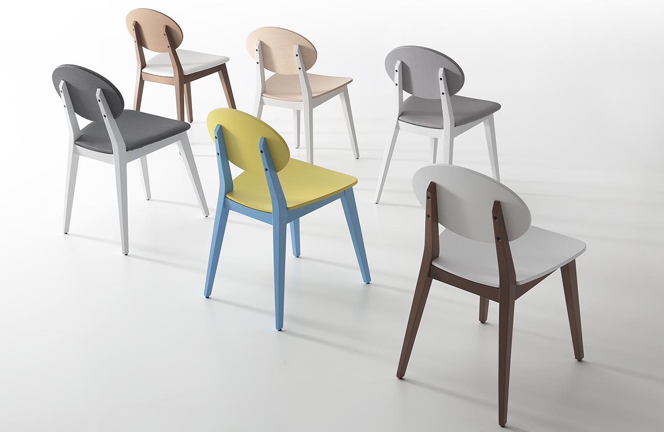 Silla muy versátil. Con un chasis de madera, permite seleccionar el respaldo y el asiento en madera o tapizado todo uniforme y también combinado.