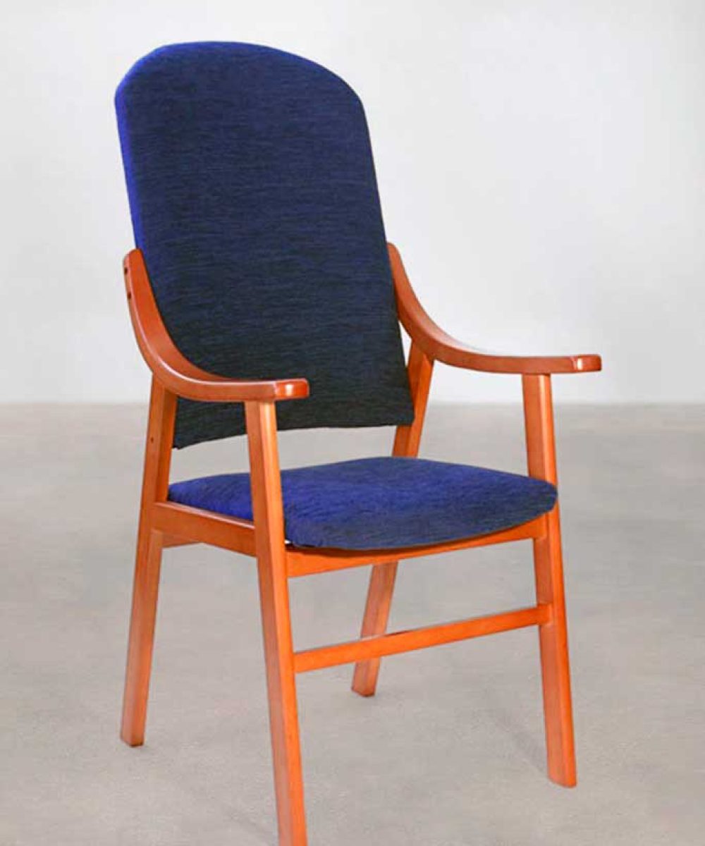 El respaldo alto está diseñado para proporcionar un apoyo óptimo, mientras que el asiento, relleno con espuma de alta densidad, asegura un confort duradero, incluso durante largas jornadas de uso. Los reposabrazos integrados y las patas de madera de haya barnizada aportan un toque cálido y natural que realza su presencia en cualquier espacio.