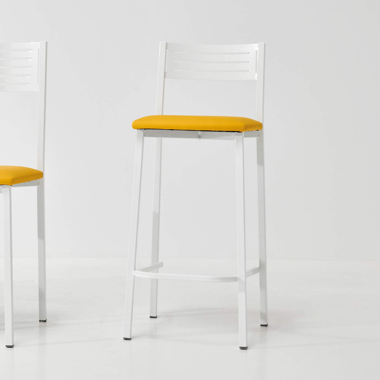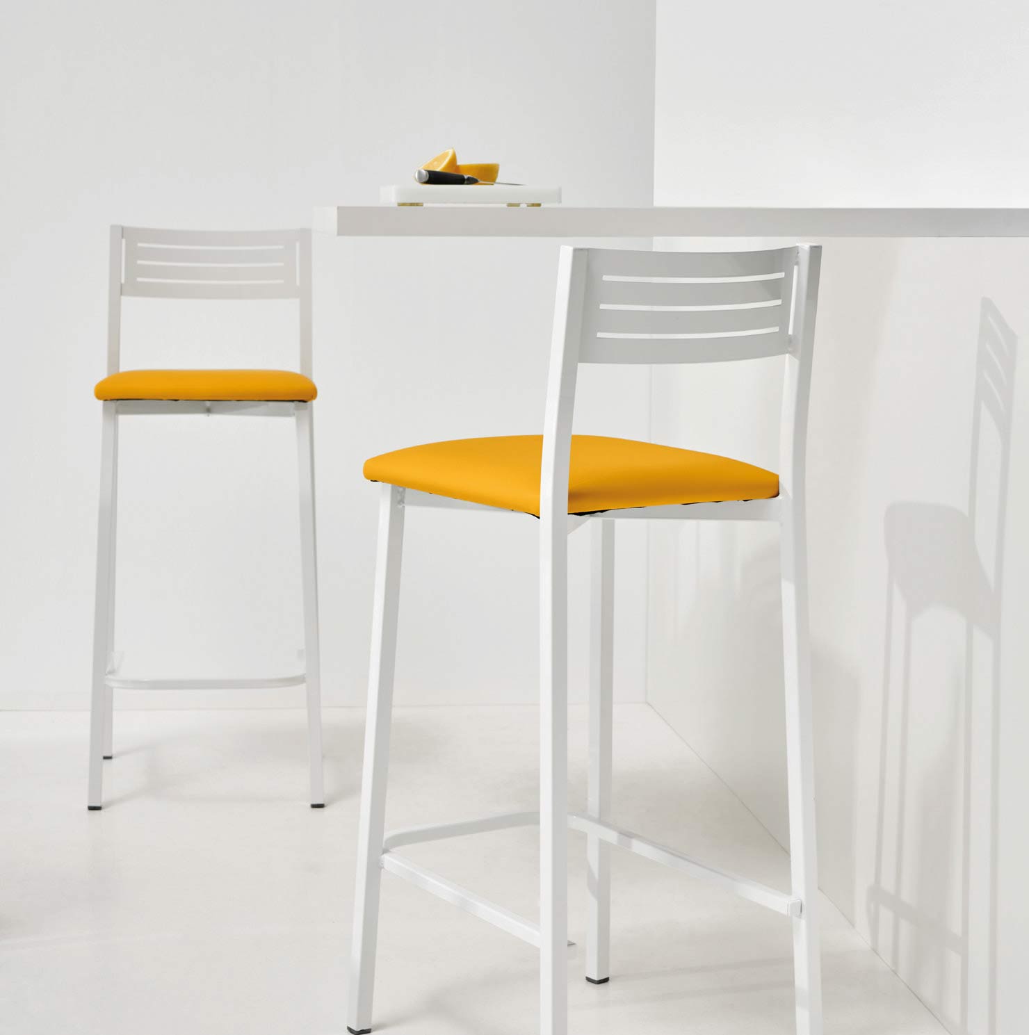 El taburete Alto 60 cuenta con un diseño minimalista en el que las líneas caladas en su respaldo a modo de parrilla, generan juegos de luces y sombras que bañaran el entorno de tu cocina. Este respaldo lumbar tiene la inclinación adecuada para proporcionar un apoyo cómodo. Su estructura en cruz bajo el asiento le proporciona una gran rigidez y a su vez le aporta una ligereza visual en la que el asiento parece estar en el aire. Un producto muy versátil con una gran variedad de acabados que puede encajar en cualquier tipo de cocina.